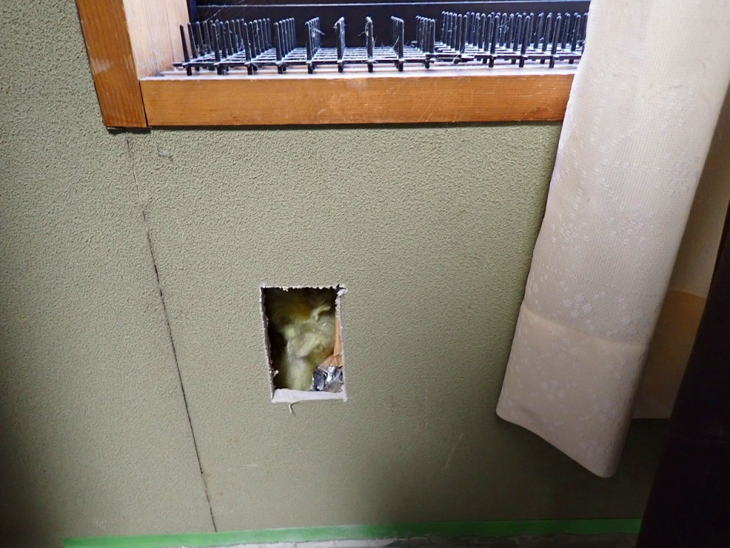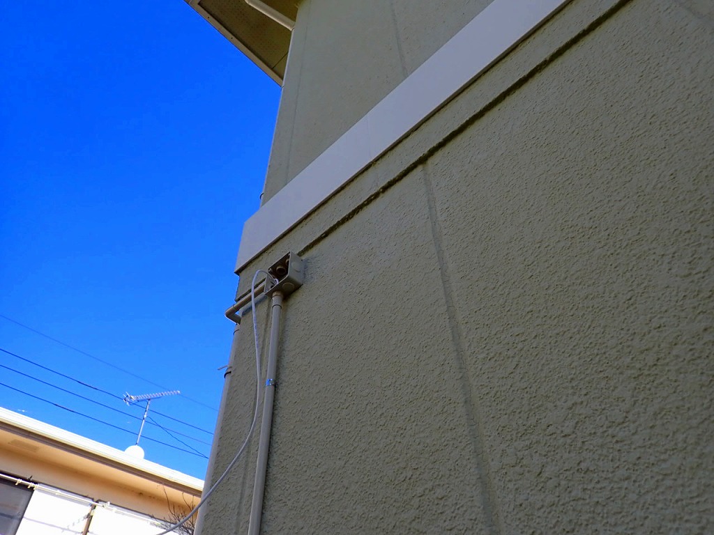 先日アンテナ工事で伺った埼玉県越谷市のお客様宅に防犯カメラの取付工事で伺いました。 電線が出ている場所にに設置します。 元々ブラケットが付いていて劣化のため外したそうです。 室内の…