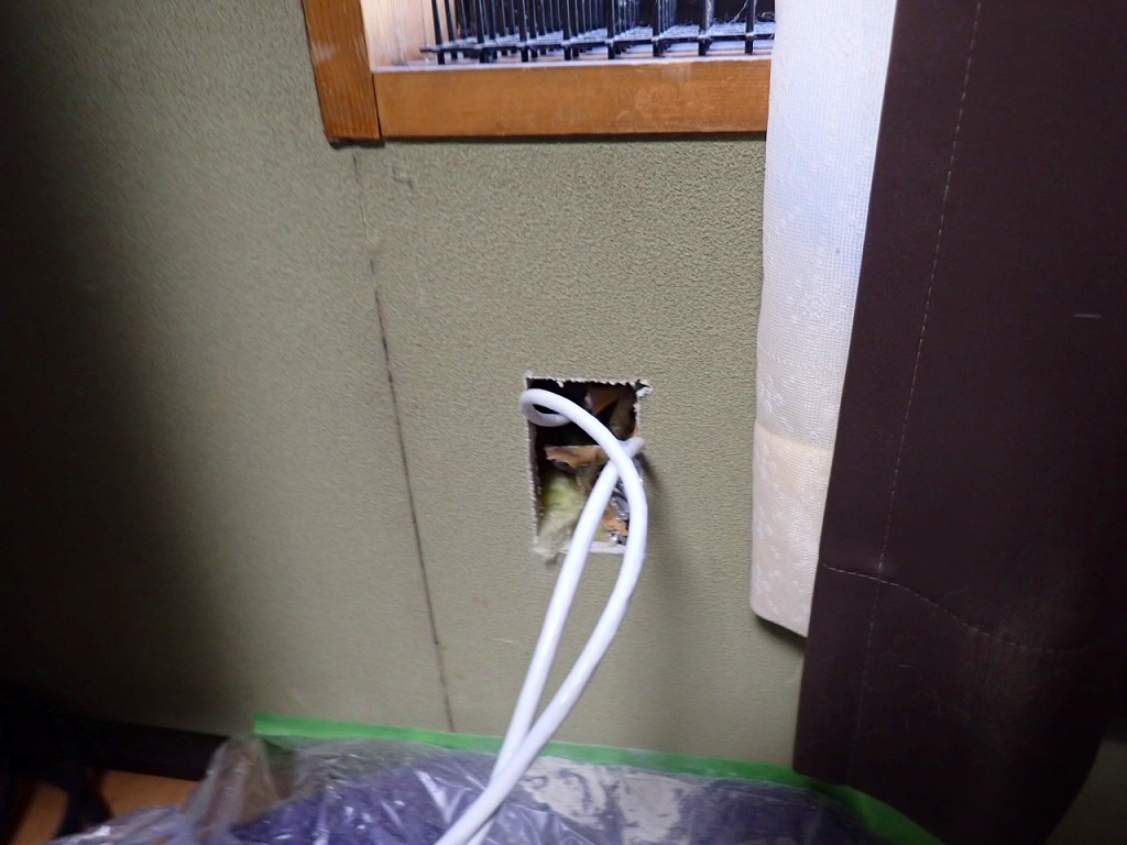 埼玉県伊奈町に伺いました。 テレビを壁掛けにするそうでテレビの裏側に来るようにテレビ端子とコンセントを少し高い位置に設けたいそうです。 真上の位置で隠れ…