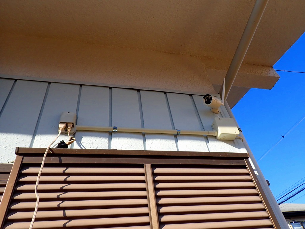 千葉県野田市に防犯カメラの取付工事で伺いました。 ご自身で無線ネットワークカメラを買って雨樋に付けたそうですが電源工事が出来ないのでその工事をやって欲しいとのことです。 近くに給湯…